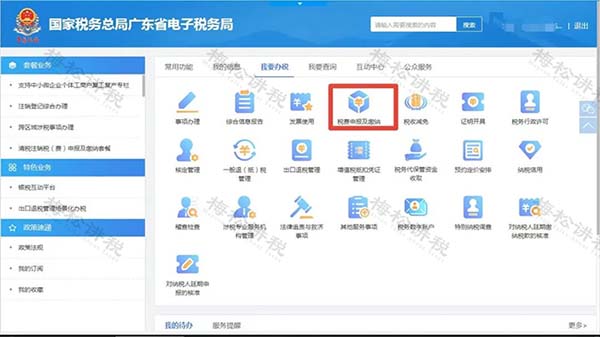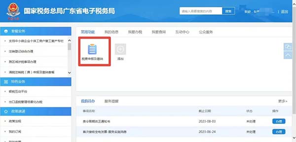 納稅人可登錄電子稅務(wù)局,點擊首頁左邊“常用功能—稅費(fèi)申報及繳納”模塊,或點擊“我要辦稅—稅費(fèi)申報及繳納”。