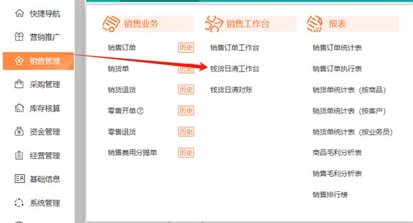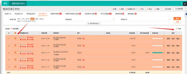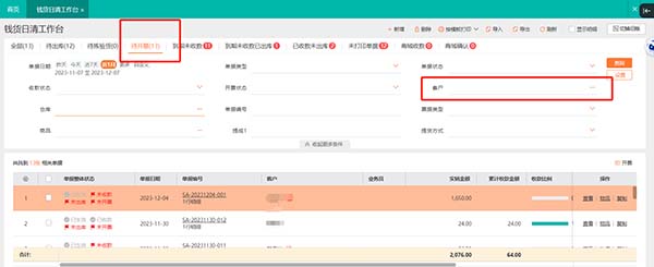 1、點擊【銷售管理】-【錢貨日清工作臺】-【待開票】,在表頭篩選下要開票的客戶名稱。