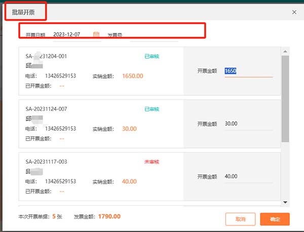 2.勾選要進行開票的單據,點擊表體右上角的【開票】,輸入發票號、開票日期等數據,即可對多張單據進行開票處理。