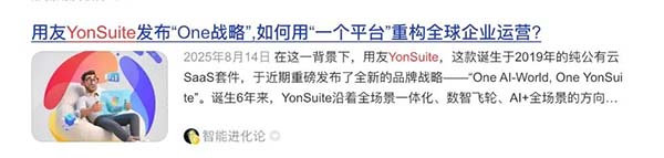 它提出的“雙One”,既是對未來的宏大描繪,也是對自身角色的精準定位:One AI-World,勾勒AI驅動的新商業世界;One YonSuite,宣示成為全球成長型企業最優核心平臺的決心,也意味著一次 All-in-ONE 的戰略升級。